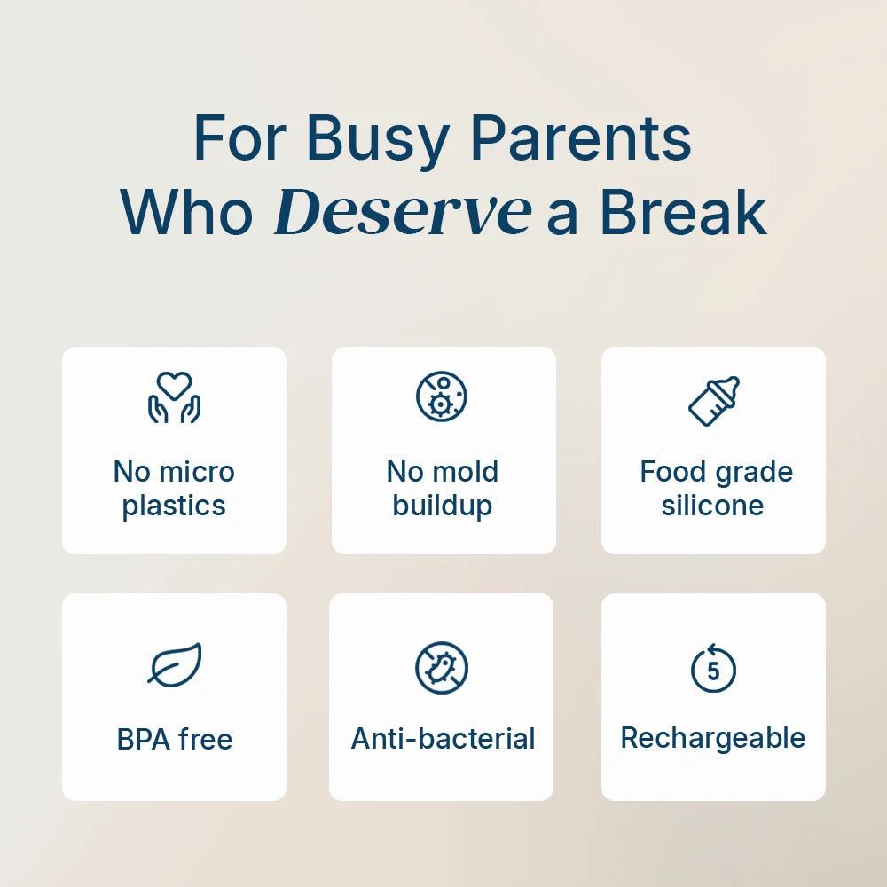 We get it — you’re running on 3 hours of sleep and just don’t have it in you to scrub another bottle. The PowerBrush does the work for you with one-button ease and fast, thorough cleaning. It’s not lazy… it’s smart.