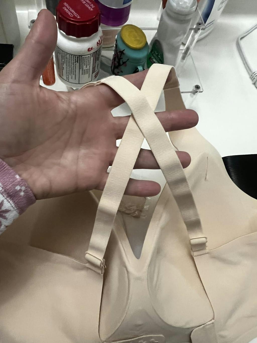 So far this bra is the best comfort I’ve found in a long time. It stays where it belongs and the straps aren’t digging into my shoulders. I’ve only tried the straps cross-crossed once and I must be goofy because I had a very hard time getting my arms through the straps after attaching each one to the other side.