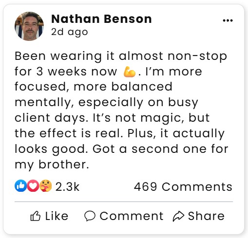 Wearing Bracelet daily has seriously helped my focus at work. I feel more present, more locked in. I didn’t think a bracelet could do anything, but I’m glad I gave it a shot. Feels like I’m operating on a better frequency.